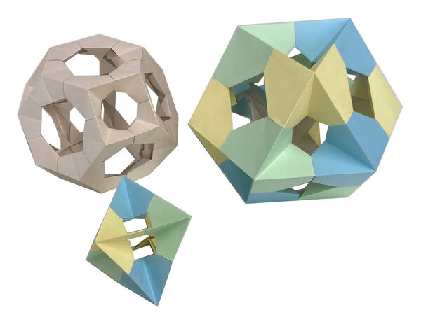 Modular origami involves building wonderful large objects from simple units. The Sonobe unit impresses with its simplicity and flexibility and is well suited to building star-like polyhedra. It consists of a parallelogram with angles of 45 and 135 degrees, which is folded on three lines in total like a wave. In the middle part there are two pockets into which the tips of the other units can be placed. Depending on the (diagonal) folding of the square middle part, a wide variety of geometric bodies can then be built.