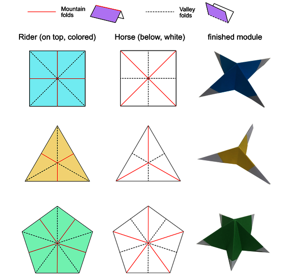 This year we're folding paper again! We'll be building wonderful polyhedra from different modules. The modules are easy to fold from triangular, quadrilateral, or pentagonal paper and then put together.